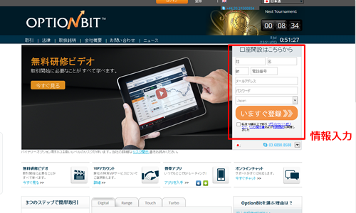 オプションビットの口座開設を説明します。始めにオプションビットの公式ページへ移動しオプションビットの公式ページの右に設置してある『口座開設はこちら』の欄に必要な情報を入力します。